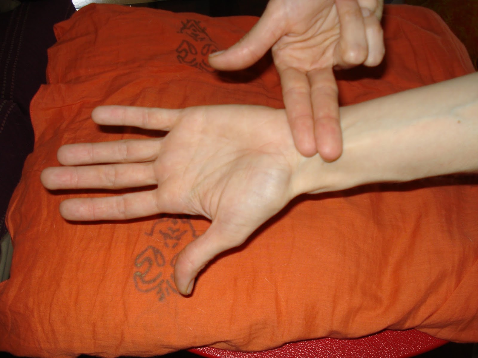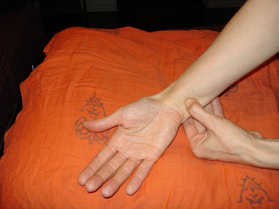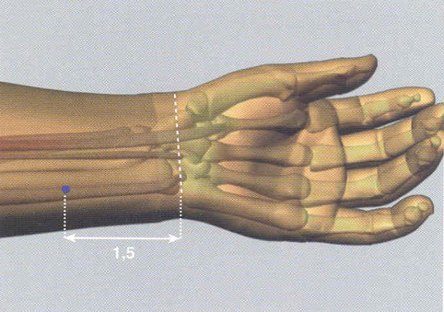 Revisa tu muñeca a la altura del dedo meñique (dedo pequeño de la mano) y con el pulgar de la mano opuesta ubica un punto que se localiza aproximadamente a dos dedos del pliegue de la muñeca – o 1 tsun, que es la medida de acupuntura – (ver ilustración de arriba y foto 1). Lo vas a palpar entre los dos primeros tendones del túnel carpiano (ese que se afecta bastante cuando usamos mucho el mouse).