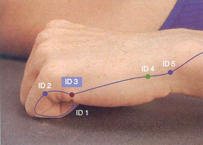 Hoy te traigo este punto de fácil acceso, como todos los que te propongo, para que te resulte cómodo y fácil practicarlo tú solo. El punto ID 3 (Intestino Delgado 3) sirve para tratar varias cosas, como habrás leído más arriba. Con él puedes tratar problemas de visión, como inflamación ocular, mejorar la agudeza visual, problemas en muñecas y antebrazos y dolor en dedos de las manos. También se utiliza en tratamientos con Zen Shiatsu para mejorar problemas lumbares (lumbalgias) y cervicales (cervicalgias).