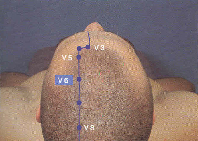 Hallarlo es muy simple; sólo debes calcular unos cuatro dedos a partir de la línea de nacimiento del cabello (desde la frente hacia atrás) en la parte superior de tu cabeza, y a dos dedos aproximadamente de la línea central hacia cada lado. Siempre recuerda que los puntos son bilaterales: así como lo ubicaste de un lado, debes hacerlo del otro en forma simétrica para estimularlo también. Te sugiero que uses los dedos mayores de cada mano (los dedos del medio) porque tienen bastante fuerza y son los más cómodos de usar en este caso.