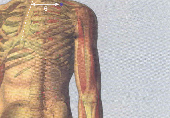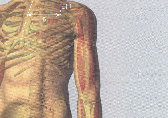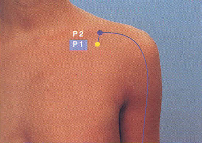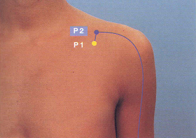 El punto P 2 se encuentra justo por debajo de la clavícula, antes de la primera costilla. El punto P 1 está inmediatamente debajo de esa misma costilla. Ambos están a 6 tsun (aproximadamente 8 dedos desde la línea media del esternón hacia el hombro). Presiona en uno de ellos (preferentemente en P 1 primero) y luego en el otro por espacio de 1 minuto o 2 cada uno; siempre recuerda hacerlo en ambos lados del cuerpo. Para ello utiliza el pulgar de la mano contraria al lado que estés tratando.